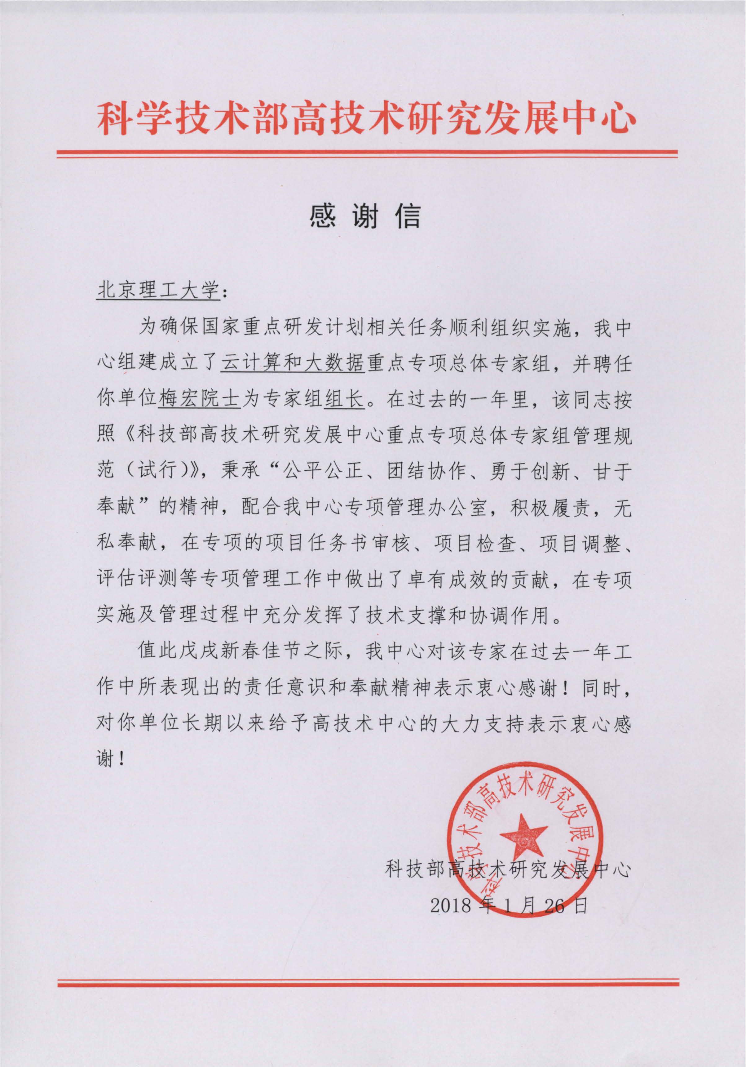 日前,金年会jinnianhuicom收到科学技术部高技术研究发展中心发来的感谢信,感谢我校梅宏院士、王涌天教授作为云计算和大数据重点专项总体专家组组...