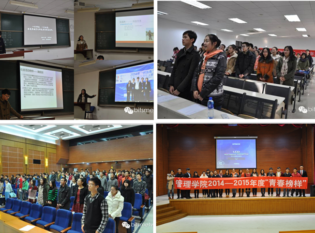 在刘芳冰老师部署了工作后,12、13级各支部团支书向大会介绍并推荐本支部的青春榜样。在聆听了各支部团支书的介绍后,各团支部开始投票。通过投票选举出13名青春榜样之后,分别进行了青春榜样代表发言以及表彰青春榜样等活动。最后由刘芳冰老师做出总结,她表示,希望通过此次活动,选出同学身边的优秀榜样,使更多的同学受到他们的鼓舞带动,创先争优,书写一个无悔的大学。