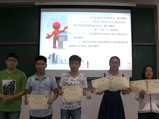 。。2015年5月14日晚,“生命之美——生命科学文化月”活动闭幕式在良乡校区顺利举行。经过一个多月的紧张活动,“生命之美——生命科学文化月”系列活动在学校领导、老师、同学们的共同努力下,画上了圆满的句号。参加本次闭幕式的有“生命之家”社团指导老师刘惠康,以及在本次“小型生态科考模拟实践”和“摄影比赛”活动中取得优异成绩的同学。