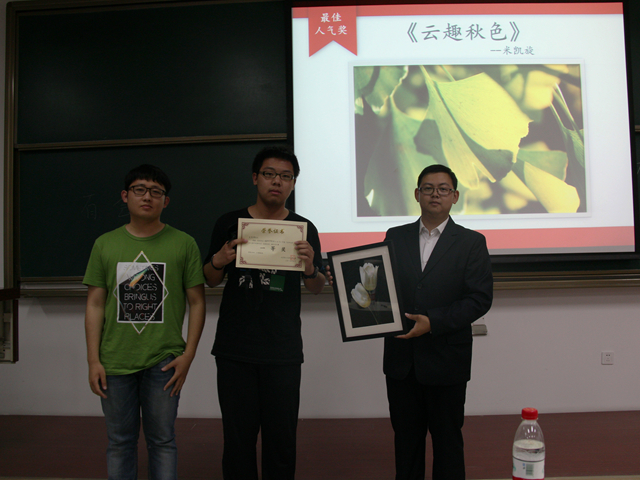 接着,“生命之家”宣传部部长曹铭铭宣布了在“生命之美”摄影比赛中取得优异成果的同学们。并展示了他们优秀的作品,由刘惠康老师为获奖作者颁发奖状和奖品。随后,由刘惠康老师致辞,对“生命之美——生命科学文化月”系列活动做了总结,并对本次活动取得的成果给予肯定,对每一位参与活动的同学给予认同。他还鼓励同学们多参与到类似的活动中去,在活动中不断的提高自己综合能力。