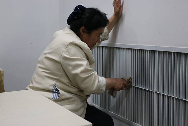 在图书馆见到这位阿姨的时候,她正在一遍又一遍地擦洗着百叶窗。看到我们的镜头,阿姨冲我们笑笑,小声说道:“别拍我了,没啥好看的。”