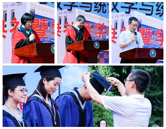 下午三时,毕业典礼暨学位授予仪式在庄严的国歌声中正式开始。首先,由数学与统计学院院长田玉斌教授代表学院向全体毕业生致辞。田院长祝贺同学们顺利毕业,同时希望同学们在未来永葆身心健康,志存高远,脚踏实地。接着副院长陈一宏教授宣读2016届本硕博毕业生名单,陈院长希望同学们能够再接再厉、求实创新,服务祖国和人民,实现人生价值。之后学院党委书记高伟涛宣读了北京市以及校级优秀毕业生名单,并向全体优秀毕业生颁发荣誉证书和学院奖章。