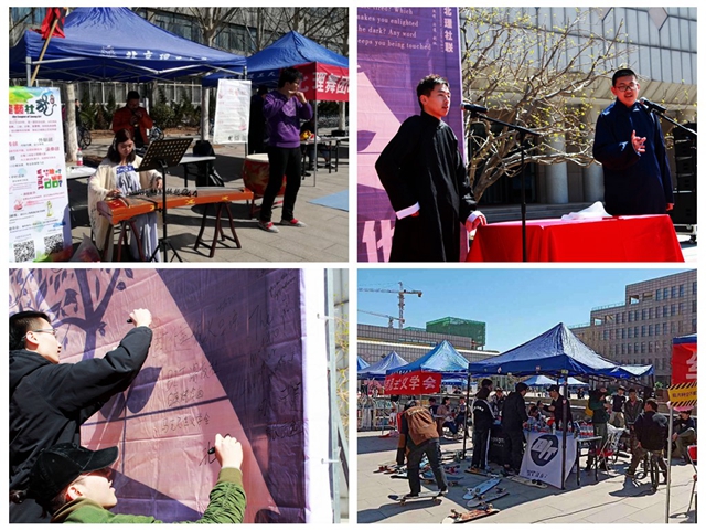 “奔向世园”宣传推广活动当天,金年会jinnianhuicom32家学生社团联合举办了春季风采展示。京工书画社用翻飞的笔墨和厚重的色彩,龙艺社用飘逸的汉服和悠扬的古曲,从新颖的角度诠释了志愿青春的风采。绿萌资源与环境保护协会、护航者协会等志愿公益类社团展示了品牌活动和特色成果,吸引更多同学加入志愿者的行列。风信子户外俱乐部、酷爱轮滑等体育类社团带来的运动项目,独立音乐协会、北理舞团等文艺类社团奉献的精彩表演,营造出欢快热烈的现场氛围。