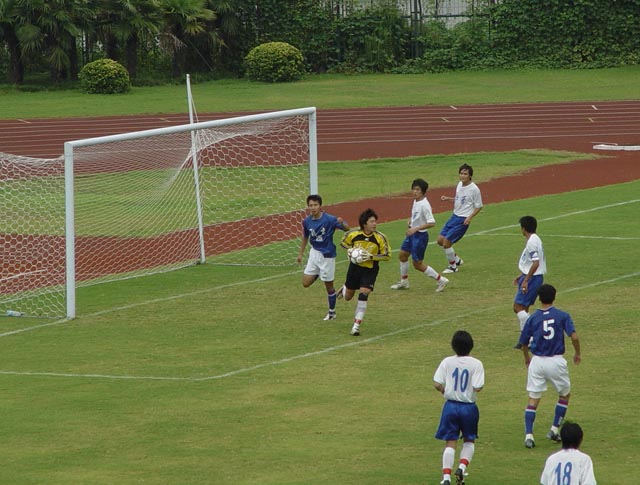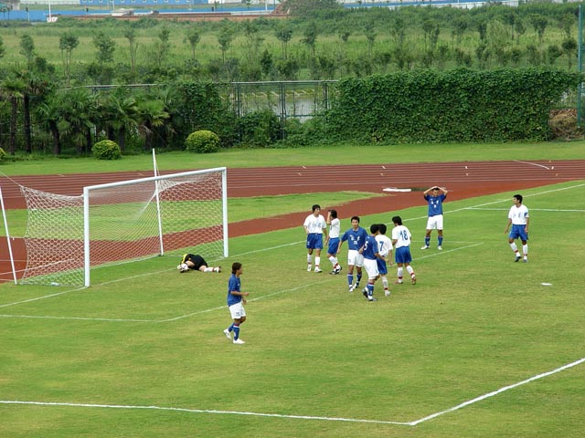 对方守门员面对连续不断的进攻,显得有点手忙脚乱。