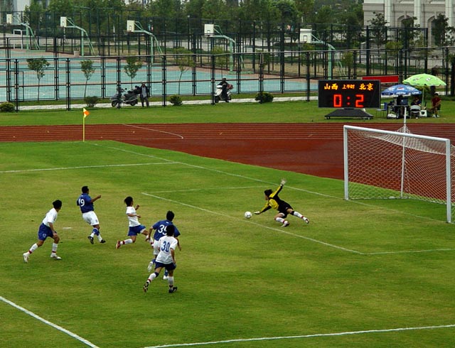 最终比分锁定在2:0,我校足球队进入前四,明日将与河北队进行半决赛。