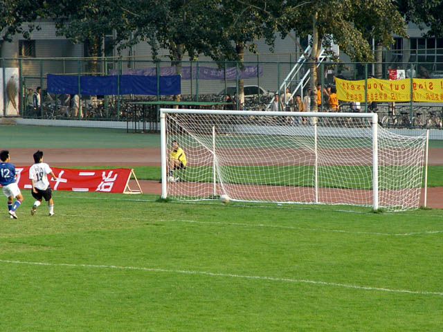 北京联合大学足球队在上半场的比赛中先胜夺人,率先破门。