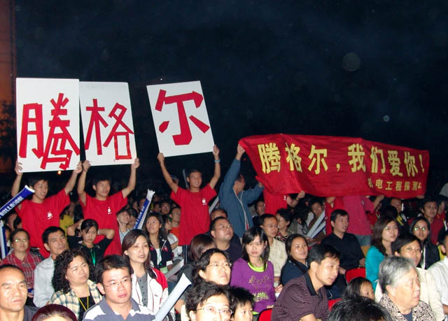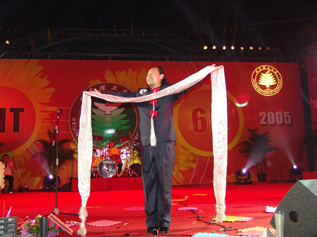 文艺晚会的压轴大戏是我校兼职教授、著名蒙古族歌唱家腾格尔和他的“苍狼”乐队的劲爆演出。