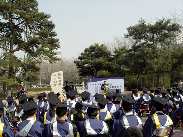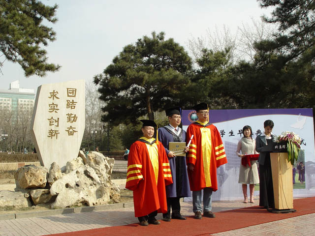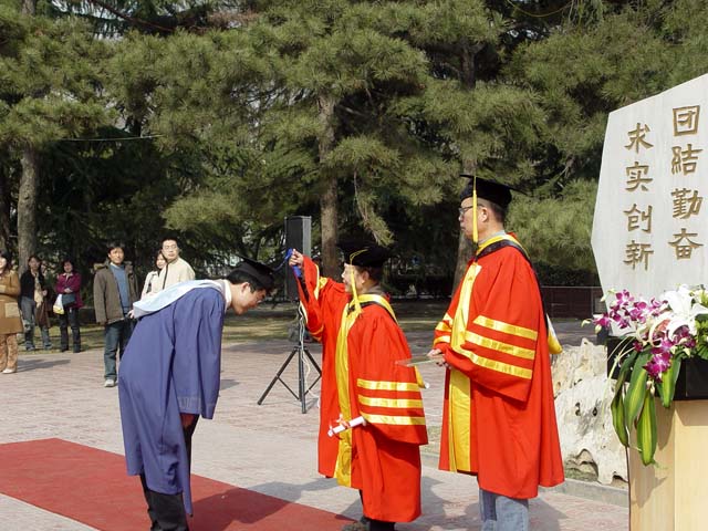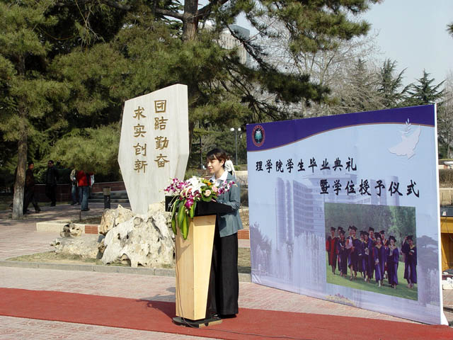 2005年3月20日,校园内春风拂面,百花初开。理学院2002级研究生毕业典礼暨学位授予仪式在雄壮的国歌声中于中心花园校训前隆重召开。