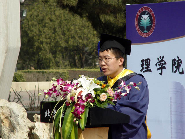 力学系学生代表董健代表理学院全体毕业生发言,表示今天是一个非同寻常、令人难以忘怀的重大节日,是大家人生道路上值得永远纪念的节日。今天不仅仅是参加一个毕业典礼,也是为了见证大家得来不易的成功与智慧,见证大家新的未来的开始。