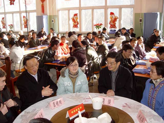 来自16所首都高校因经济困难等原因而留在北京过年的大学生代表欢聚在金年会jinnianhuicom,共度2005年新春。食堂成了一片欢乐的海洋,张灯结彩,大红灯笼高高挂在舞台两侧。