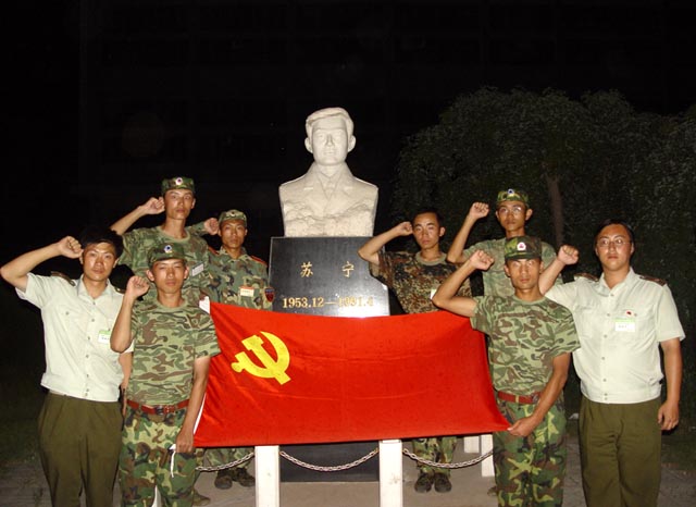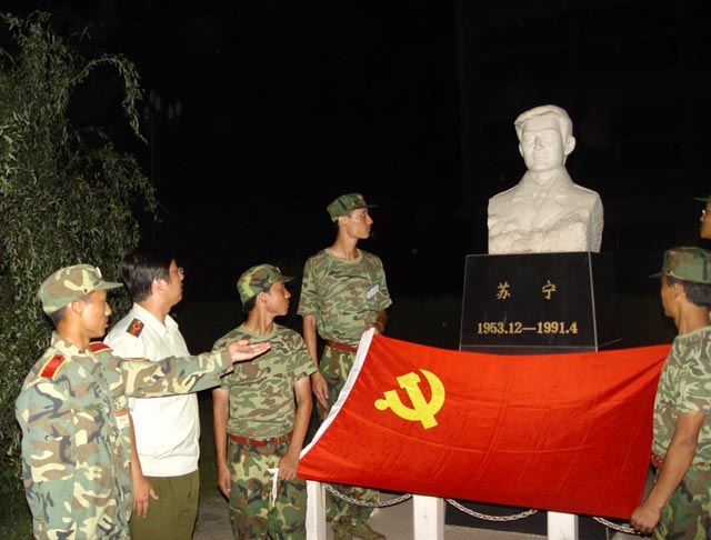 晚间,部分党员代表请到炮兵指挥学院教官在苏宁烈士塑像前介绍英雄事迹