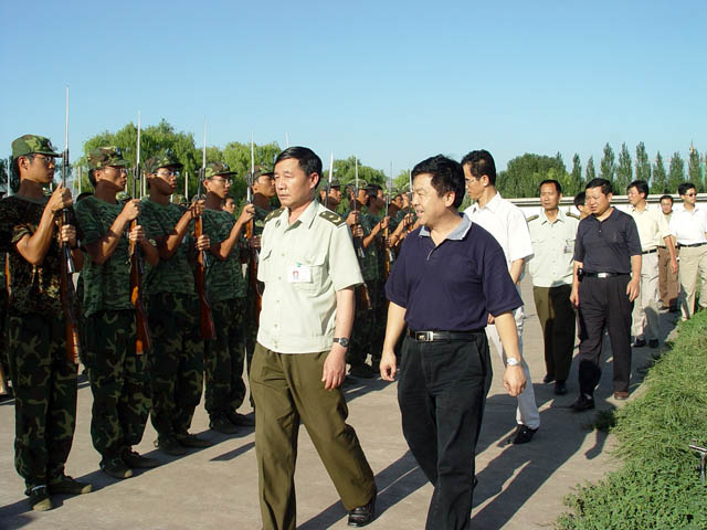 副书记、副校长杨宾、副校长孙逢春和炮兵指挥学院副院长郎守林少将在检阅训练中的学员