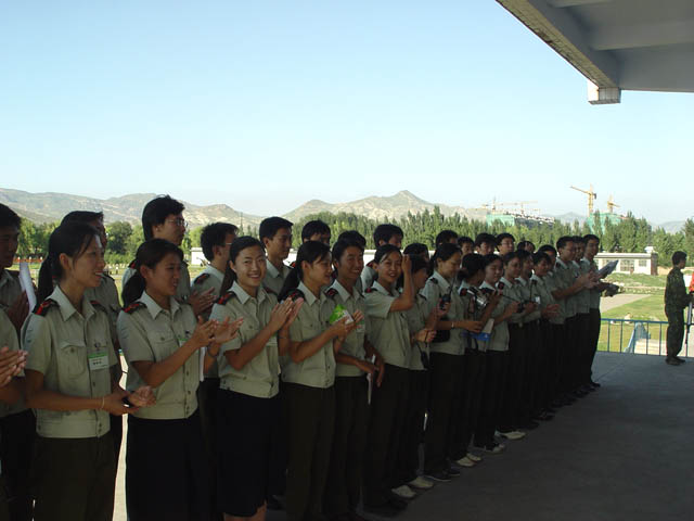 军训干部在训练场前迎接慰问团