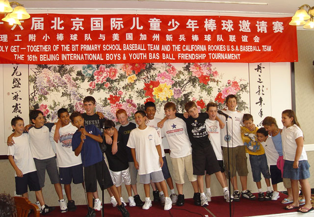 会上,两国棒球的教练,队员相互交流,切磋球技。孩子们表演节目,互送礼物,气氛友好热烈。