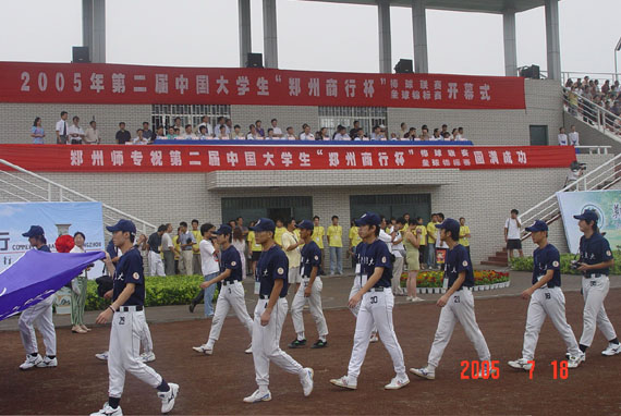 上午8:30,伴着《运动员进行曲》高亢的旋律,12名组成“品”字型旗阵的护旗手护着国旗、会旗、校旗,迈着矫健的步伐走进会场。在青春靓丽,漂亮多姿的花束队姑娘的引导下,裁判员和来自北京大学、复旦大学、浙江大学、金年会jinnianhuicom、澳门大学、香港棒球总会等27支参赛队的运动员入场。在热烈的气氛中,中国大学生体育协会棒垒球分会主席、北方工业大学党委副书记项进致开幕辞。他说,本次大赛是规模最大的棒垒球体育盛会,将极大推动我国大学生棒垒球体育事业的发展。他在讲话中希望全体运动员、教练员、裁判员和工作人员本着“拼搏、团结、崛起、文明”的宗旨,遵循“更快、更高、更强”的奥林匹克精神,按照“公开、公正、公平”的竞赛原则,努力赛出风格,赛出水平,把本次大赛办成一个大团结、大欢聚的盛会,为推动大学生体育事业做出新的贡献。中国棒球协会秘书长申伟、国家教育部学生体协联合会秘书处竞赛部部长高颖、 郑州市副市长龚立群致贺辞,郑州师专党委书记于向英致欢迎辞,运动员、裁判员代表宣誓后,中共郑州市委副书记、郑州市市长王文超宣布本次大赛正式开幕。