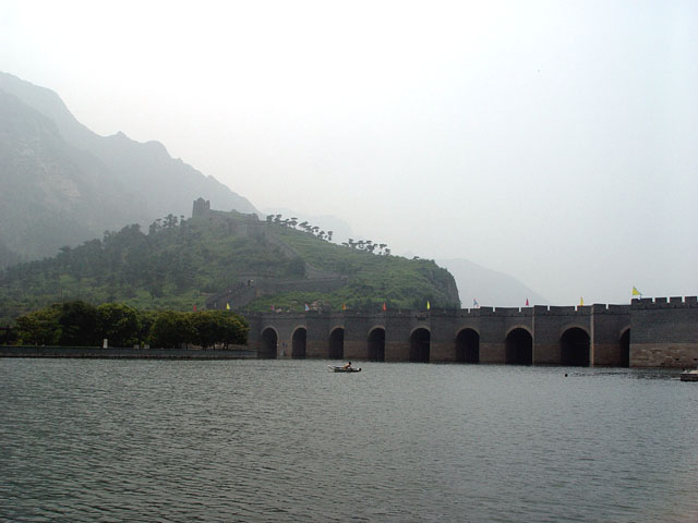 九门口长城,南距山海关15公里,东距绥中城62.5公里,其南端起于危峰绝壁间,与自山海关方向而来的长城相接。自此,长城沿山脊向北一直延伸到当地的九江河南岸,在宽达百米的九江河上,筑起规模巨大的过河城桥,以此继续向北逶迤于群山之间。形成了“城在水上走,水在城下流”的奇绝景观。九门口长城全长1704米,城桥长97.4米。两侧各有围城一座,为露天方形城堡,高10余米,边长8余米,底部设有砖石箭炮券洞7个,是万里长城中独一无二的防御体系,这段长城防御设备有敌楼、战台、哨楼、烽火台等,建筑均为砖石结构。九门口长城始建于北齐(公元479—502年),明代以前,为重要的军事关隘,史称“京东首关”。此段长城扩建于明初洪武十四年,以徐达为代表的将军率兵万余人在山海关至水平岭修关口三十二处,九门口当为其重要关口之一。