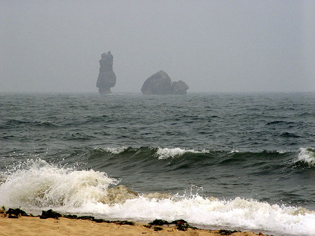碣石距山海关15公里,位于绥中县城西56公里处的止锚湾海滨,在距岸边200余米的海面之中,耸立着三块巨大礁石,高出海面约20余米。 这里也是民间传说为孟姜女投海葬身之处。每逢落大潮,从岸边到礁石隐约现出一条巨石铺就的海中栈道,可直达礁石脚下。在姜女坟的东西两侧海岸,各有一峭壁伸向海面,东侧叫红石砬子,西侧叫黑石砬子(又称黑山头),象两条巨龙静卧在海中,构成似"二龙戏珠"(海中礁石)的独特景观。红石砬子、黑石砬子和碣石正对的石碑地都发现了秦汉皇帝巨大的行宫遗址。