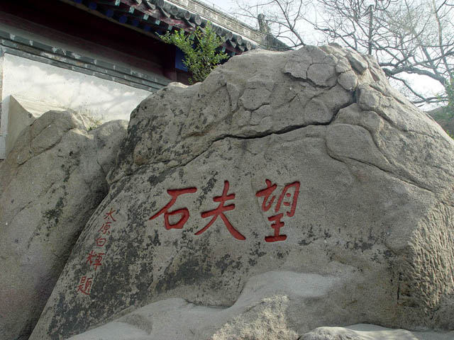 殿后有"望夫石",传说为孟姜女登石望夫之处,石上有阴刻"望夫石"3字,为清代山海关通判白辉所题。石上有坑似足迹。石旁有乾隆皇帝题诗。"望夫石"后有多处刻留的小石台和六角亭,名"梳妆台"和"振衣亭"。传说为孟姜女望夫前梳妆整衣的地方。