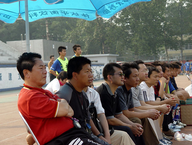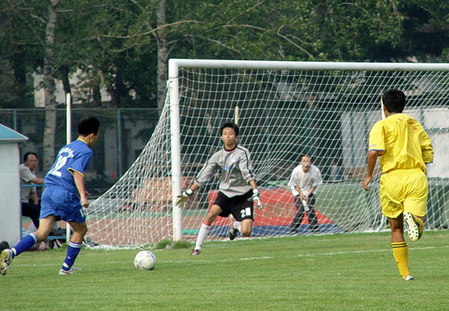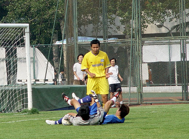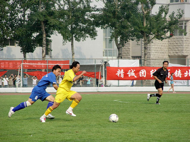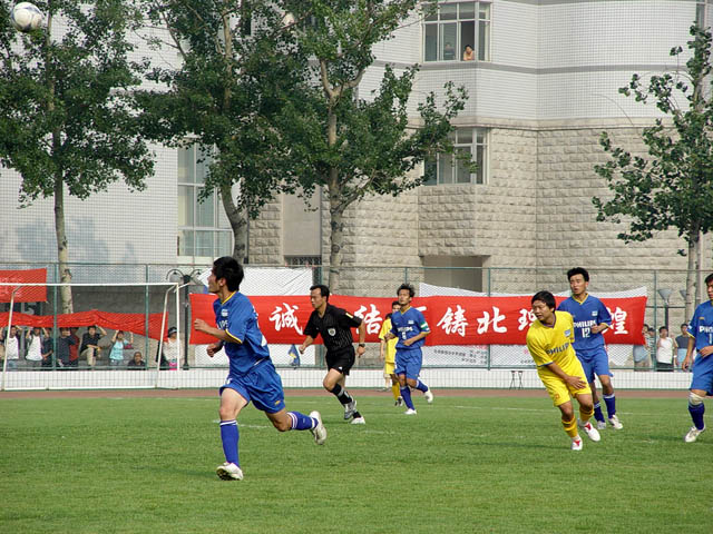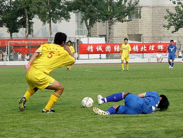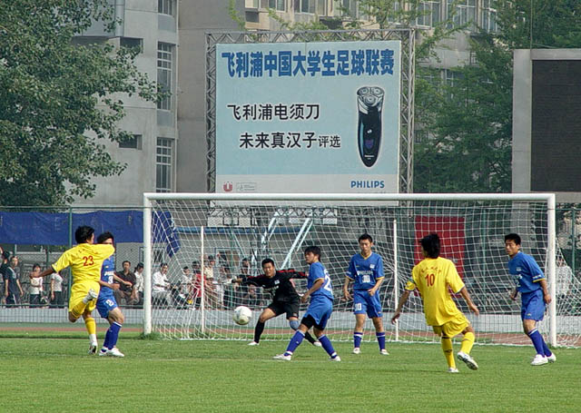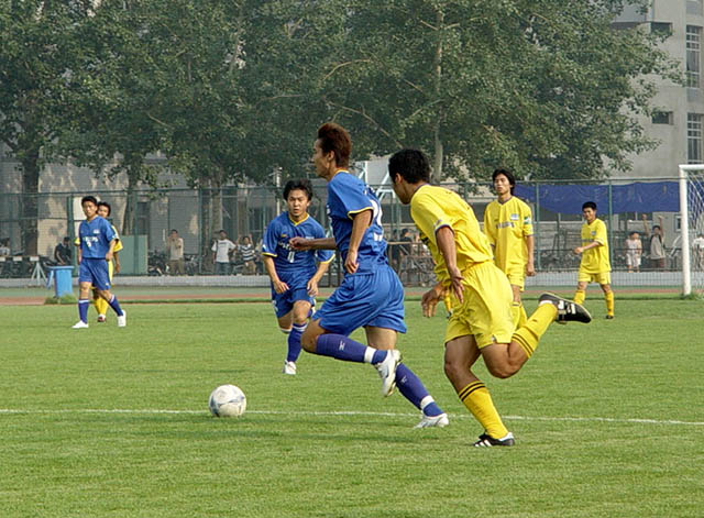 在6月7日下午3:00举行的第五届飞利浦中国大学生足球联赛总决赛小组赛最后一轮比赛中,我校足球队(蓝方)以3:0战胜广东工业大学足球队(黄方),保持了全胜的战绩,以总分9分名列小组第一,顺利进入下一阶段的比赛。8日赛事休息一天,9日开始八强将捉对厮杀,争夺进入前四名的机会。