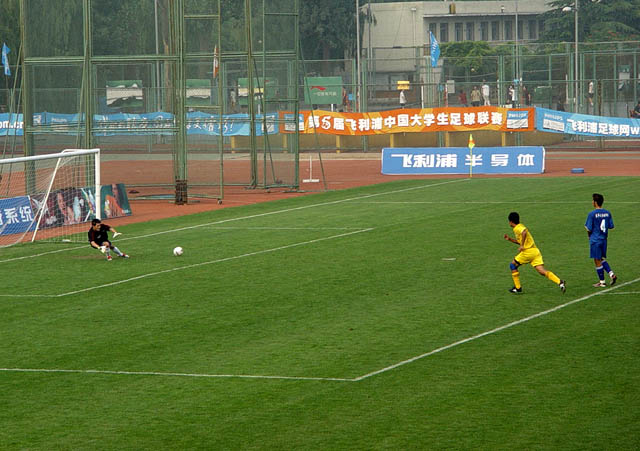 在去年上海大运会足球赛场上,我校足球队曾与东华大学队两次交手,首场比赛和冠亚军争夺赛均打成了0:0,只是在决赛的加时赛后点球决胜时以微弱优势负于对手,屈居亚军。