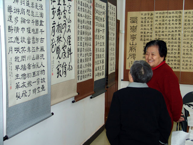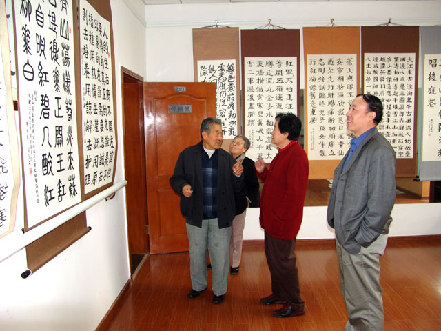 张治平先生在与参观书法展的教师进行沟通交流。