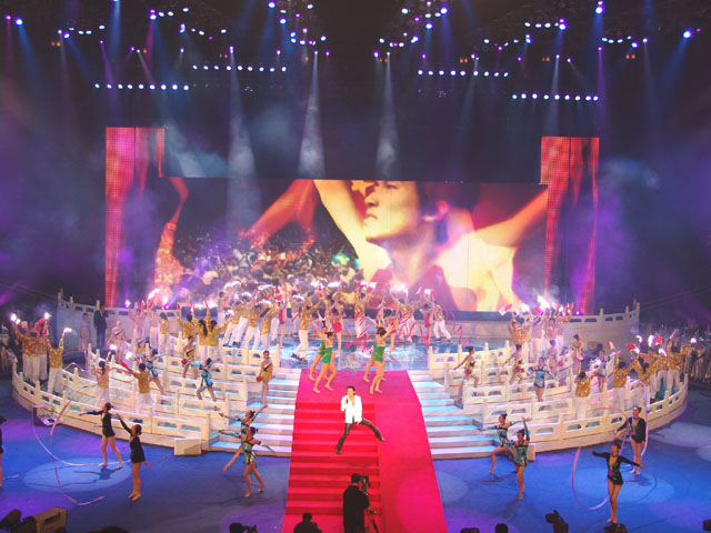 文艺演出的第四个节目是《为你荣光》,由香港著名歌星谢霆锋演唱歌曲,我校同学担任伴舞,其精彩的表演赢得了现场观众的阵阵欢呼。