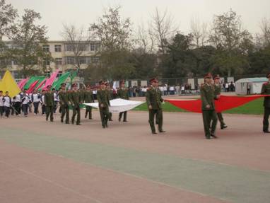 在雄壮的乐曲声中,运动员入场式气氛热烈,精彩不断,以班级为单位的方阵依次从主席台前走过。首先走过主席台的是由部分大一新生组成的彩旗方阵和鲜花方阵,整齐的方阵,响亮的口号,迎来阵阵掌声。