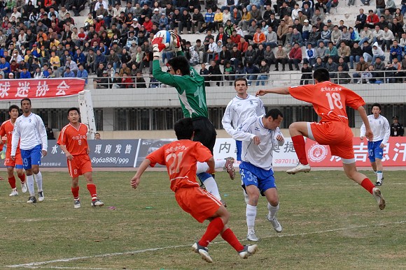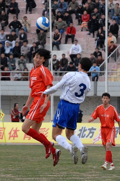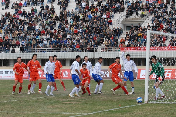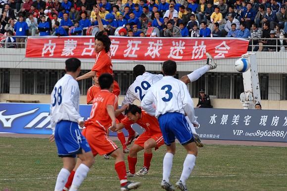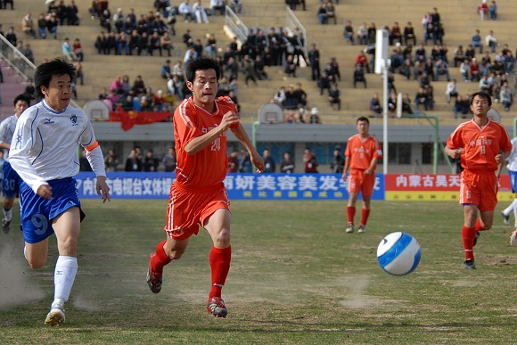 开场后,呼和浩特队主要在左路展开攻势。第22分钟,爱国者大学生队11号王强在右路形成突破,但被对方38号袁哲及时解围。第27分钟,爱国者大学生队获得角球,8号队长袁微传向远点,跟上的队友将球传入禁区,但用力过大出了底线。第33分钟,爱国者大学生队在对方禁区中路进行配合后传入禁区,21号张淼门前抢点未果,这也是学生军最有威胁的一次进攻。第35分钟,呼和浩特队逼得角球,队长9号张考主罚,新加盟的3号南斯拉夫外援头球高出。