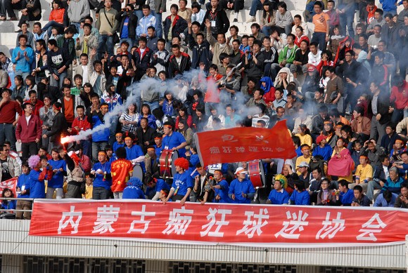 整个上半场,热情的主场球迷不遗余力的呐喊助威,并多次掀起人浪。第40分钟,球迷的努力终于得到回报,10号韩德名在禁区混战中头球首开纪录!!