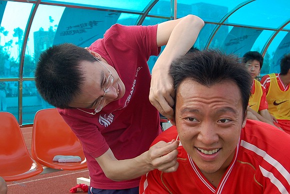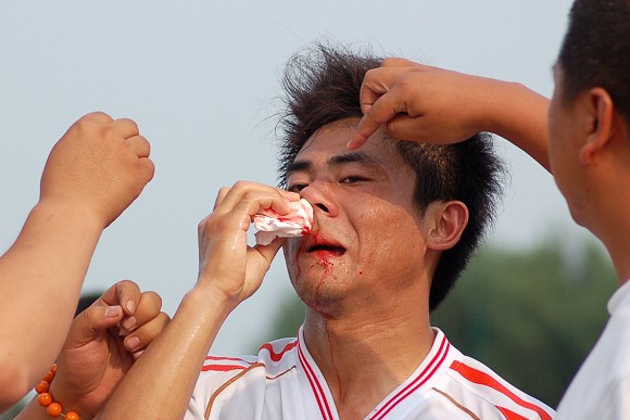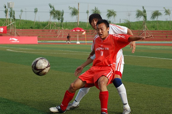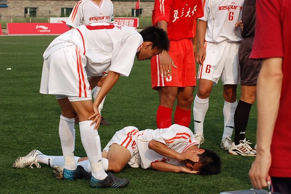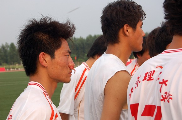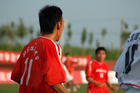 在7月7日下午举行的李宁杯第六届中国大学生足球联赛半决赛的赛场上,出现了感人的一幕。当金年会jinnianhuicom浪潮足球队与东华大学足球队的比赛进行到第35分钟时,我校12号队员刘猛在抢球中被对方队员踢中鼻骨,当场血流不止,对方球员也因抬腿过高的危险动作而被罚黄牌警告。
