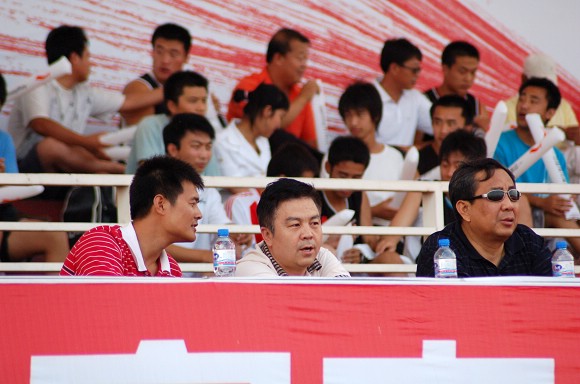 北京市教委副主任杜松澎(右)、我校党委副书记、副校长杨宾(中)和教育部、中国足协等单位领导一起在主席台就坐并观看了整场比赛。