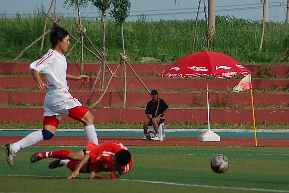 此后,袁微成了对方的紧盯热点,第25分钟,袁微带球突破,在禁区前沿再次被对方绊倒,对方防守队员被黄牌警告,我方获任意球机会。