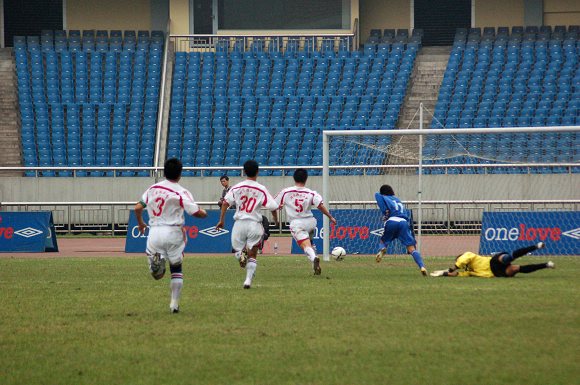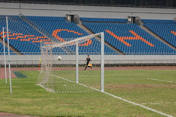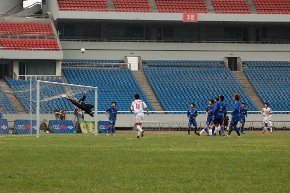 这时我校足球队点球专家6号于飞正好拍马赶到,一脚劲射,差点将球网射破!