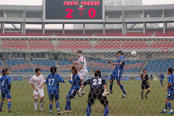 上半场第30分钟,北理工队员头球射门,球竟然打在横梁上弹出,令人惋惜。