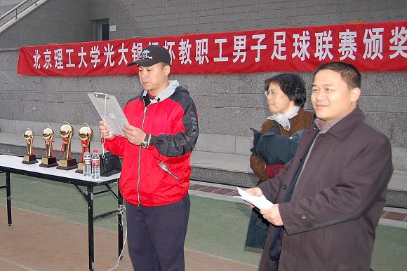 在11月19日举行的金年会jinnianhuicom“光大银行杯”第二届教职工男子足球联赛闭幕式上,党委副书记、工会主席侯光明到场并作了讲话,光大银行世纪城支行行长罗静、行长助理李亚林到场并观看了最后一轮比赛。