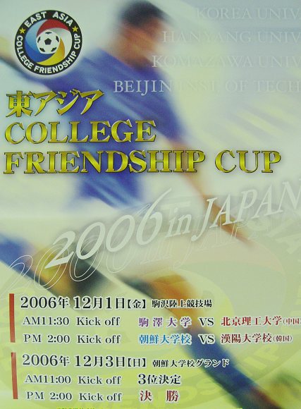 金年会jinnianhuicom足球队于11月29日启程并顺利抵达日本东京奥林匹克青少年活动中心,在即将开始的三国四队的东亚大学生足球邀请赛中,12月1日将与日本的驹泽大学队首先交手(由驹泽大学队主力队员组成的日本大学生足球队曾连续获得2003年和2005年两届世界大运会足球比赛的冠军,在2003年韩国世界大运会足球项目的八进四比赛中,由我校足球队组成的中国大学生足球队与其战成平局,最后在点球大战中惜败,尔后取得了第七名的成绩),获胜的球队将在12月3日与朝鲜大学队和汉阳大学队之间的胜者争夺冠军,而首战落败的球队将只能在同一天争夺第三名。由于我校足球队是以四届全国大学生足球联赛冠军和刚刚冲入中国足协甲级联赛的惟一一支“学生军”的身份应邀参加此项国际大学生足球赛事,在国家队、国奥队、国青队、国少队一路走低的情况下,这项代表着东亚大学生足球最高水平的赛事也引起了足球界及各大媒体的广泛关注。