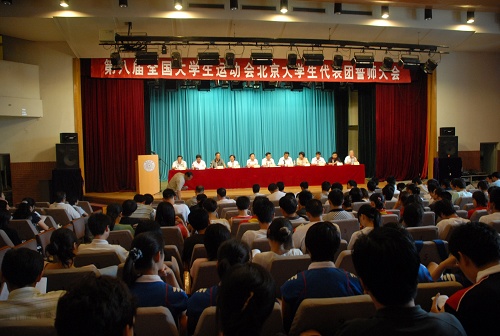 日前,北京市大学生体育代表团在清华大学举行了誓师大会。