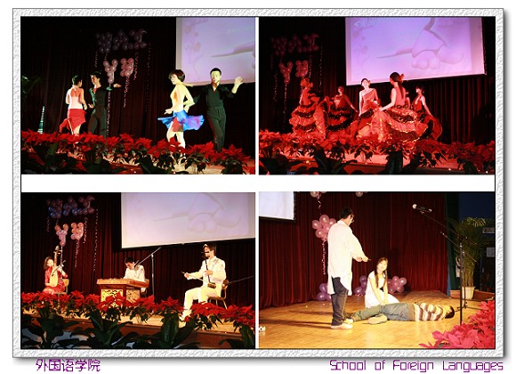 国际关系学院和我院合作演出《西班牙女郎》精彩无限;首都经济贸易大学一曲新民乐《war》,用琵琶、二胡、扬琴尽展民族艺术魅力;外国语学院“歌后”毕晓宁老师一曲《上海滩》荡气回肠;娃娃剧社《新编罗密欧与朱丽叶》风趣幽默;赞比亚留学生一曲《I'm here》引发高潮……