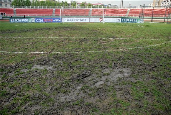 由于之前哈尔滨连续下雨,本来状况就不是很好的哈工大体育场变得更加糟糕。