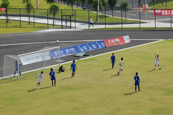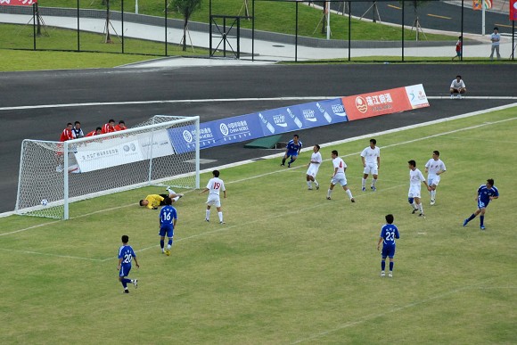 上半场比赛结束之前,北理工再次获得一次角球机会,对方守门员出击抢第一点火并未得到皮球,已经冲到门前的北理工队员武方虎接队员的头球过渡后轻松把球顶入球门,将上半场的比分锁定在5:0。这与第一场对阵陕西队的情况如出一辙,似乎胜局已经基本锁定。