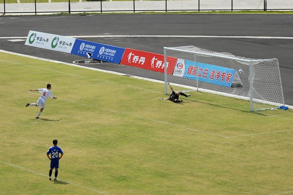 比赛进行到第20分钟,北理工的张淼禁区前的一记远射终于敲开了新疆队的大门,打破了场上的僵局。