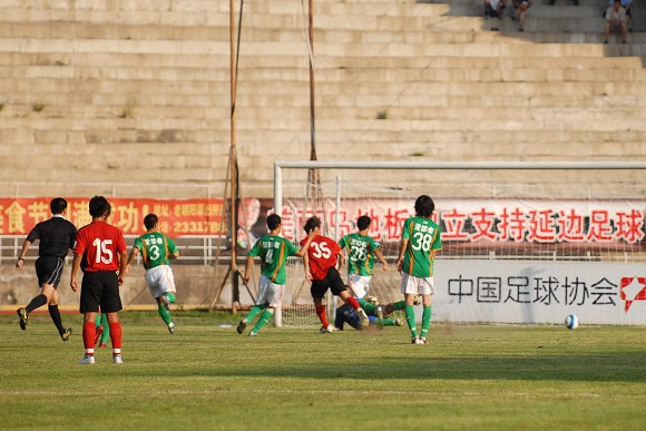 进入下半场,北京爱国者大学生队体力渐渐不支,几乎难以攻过半场,延边队的进攻也打得流畅起来。郑林国在左边路的突破非常犀利,多次创造机会。
