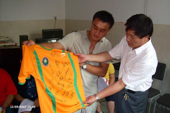 在活动的最后,我校足球队党支部辅导员付大军老师将一件由全体教练员、队员签名的主场比赛服作为礼物赠送给该校校长,表示足球队党支部以及团支部将和该校建立长期的互动关系,使每一位球队成员都能用自己的爱心来关心、帮助残疾人和弱势群体。