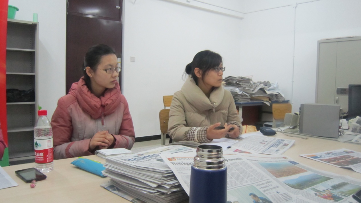 赵琳老师为研讨会准备了英文版的《中国日报》等学习材料。首先,同学们研究了英文报纸上的标题撰写。通过对报纸上标题的分析,发现了新闻标题有常用一般现在时,少用虚词,多用主动少用被动等特点。通过讨论,同学们总结出了英文标题的一般特征,对新闻标题的概念有了新的认识。其次,同学们又拿出金年会jinnianhuicom校报作为参考材料进一步分析了一般新闻标题的撰写。不管使用何种语言,新闻标题的基本属性是不变的,如简短精炼,醒目新颖,内涵丰富,同时要能吸引读者的注意力。通过对比校报和中国日报的新闻标题,新闻社的成员们更加深刻地了解了新闻标题的一般特征,也发现了中英文新闻标题的不同之处。例如,中文是动词性语言,文章标题一般是中多用动词的完整句子,而英文则是名词性语言,标题中常用名词性短语。最后,曹莉老师为同学们进行了深入细致的理论指导,同时解答了同学们在讨论中不能解决的问题。