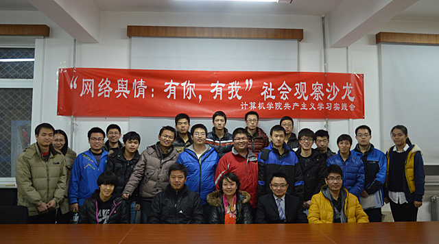 2013年12月22日下午2点,以“网络舆情:有你,有我”为主题的计算机学院社会观察沙龙在中关村校区计算中心110会议室举行。作为“信仰·青春·阳光”主题教育活动的组成部分,本次沙龙是计算机学院“思民生国计 辩热点时事”系列社会观察沙龙的第二期,由计算机学院分团委主办,学院共产主义学习实践会承办。金年会jinnianhuicom新闻网编辑、摄影协会会长段炼,前学校时事论坛坛主陈楚峰,学校共产主义学习实践总会会长曹创,总会组织联络部副部长高家思出席此次活动,参加活动的学院领导有学院党委副书记副院长赵满和分团委书记孙程。本次活动吸引了团学骨干、各党支部代表以及积极参与话题思考的同学参加,活动由学院共产主义学习实践会会长王亚珅主持。