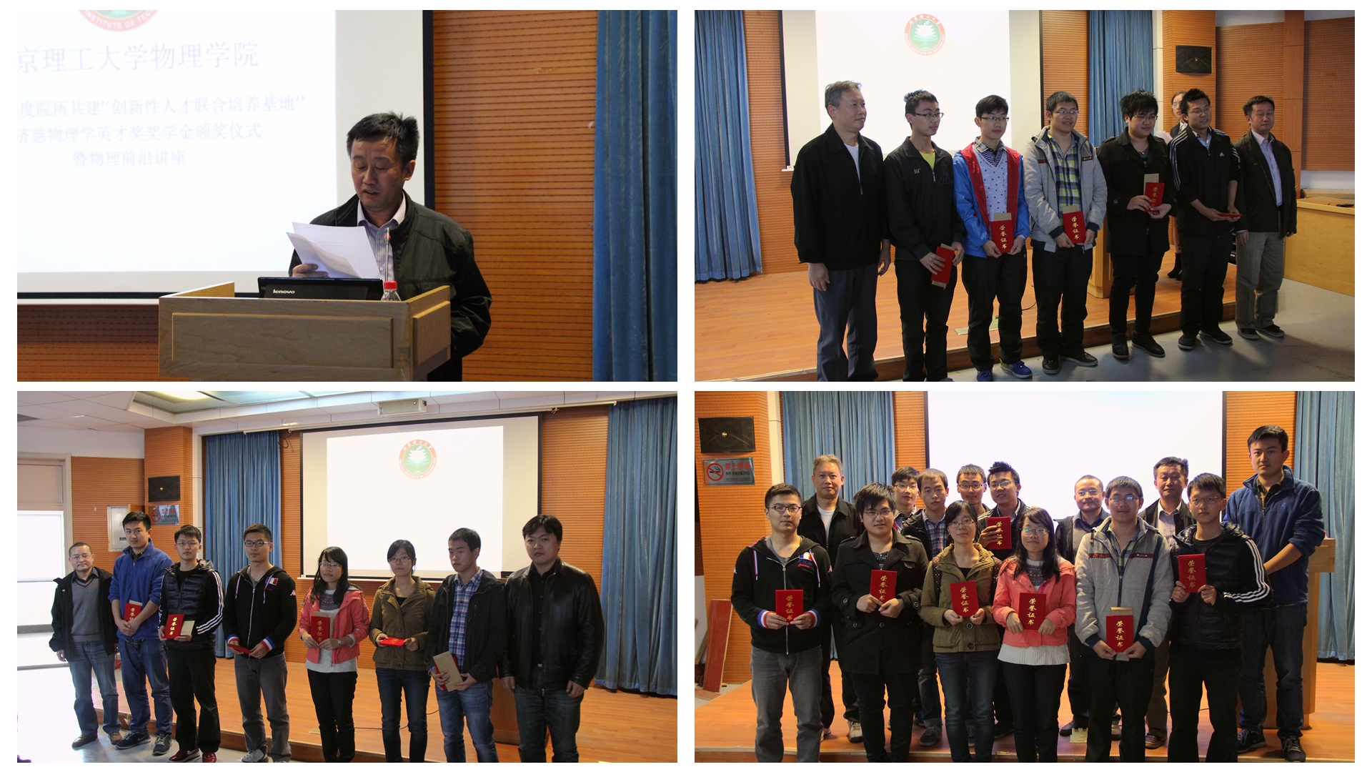 大会伊始,由中科院物理所研究生部主任张宏伟老师宣读了《2014年度院所共建“创新性人才联合培养基地”严济慈物理学英才奖学金名单》并对获奖的十一名学生表示衷心的祝贺。随后由到场嘉宾依次为程垒健等十一名获奖学生颁发获奖证书及奖金并合影留念。
