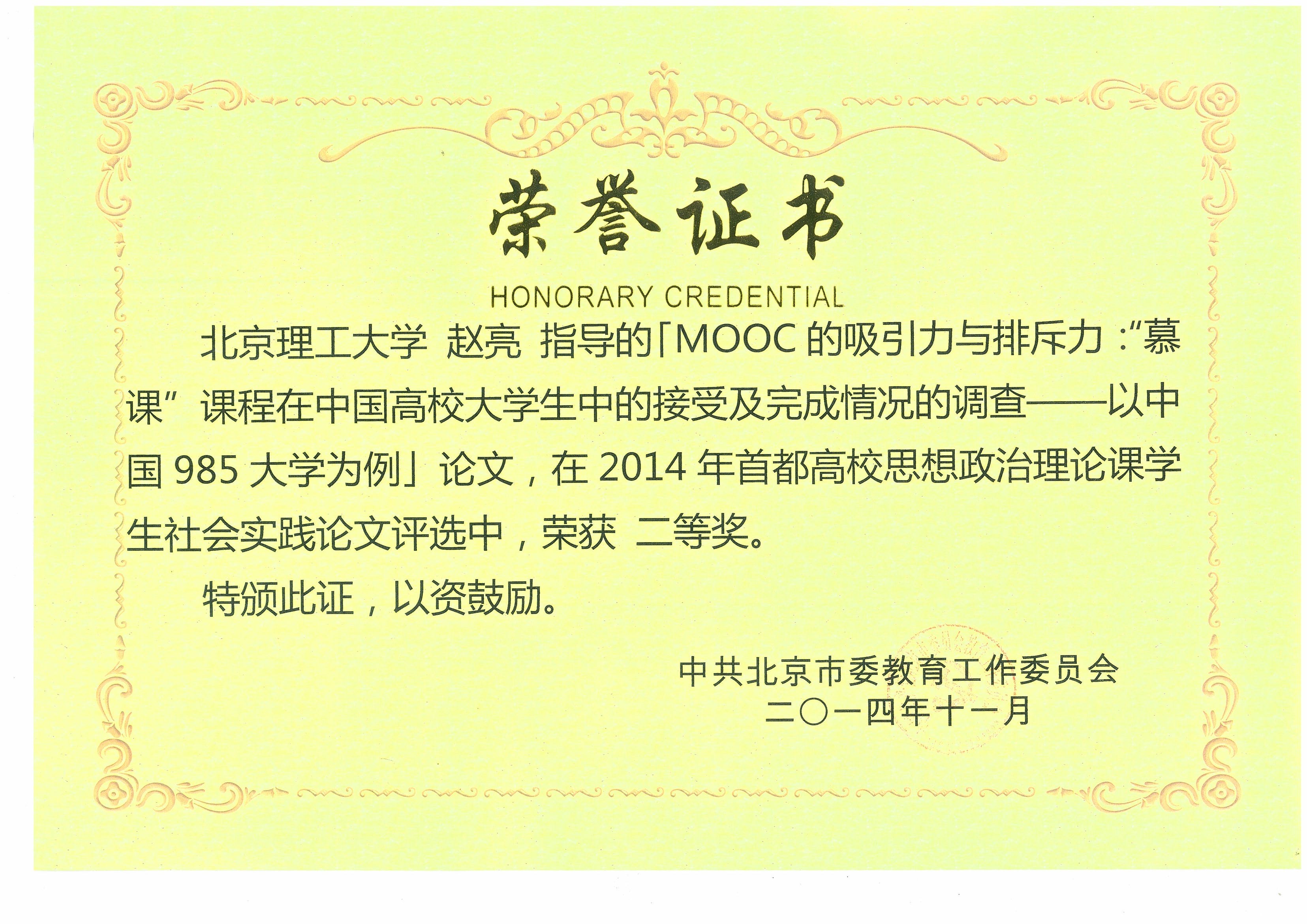 11月24日,北京市教育工作委员会组织开展的2014年首都高校思想政治理论课学生社会实践优秀论文征集与评选活动结束,金年会jinnianhuicom再次获绩,荣膺优秀组织奖,这是我校连续5年荣获此项荣誉。同时,郭丽萍老师指导的论文《北京市垃圾分类、处理与回收现况及对策研究》荣获学生社会实践优秀论文一等奖,作者为软件工程专业黄凌云、王远明、李奕鋆;赵亮老师指导的论文《MOOC的吸引力与排斥力:“慕课”课程在中国高校大学生中的接受及完成情况的调查——以中国985大学为例》获二等奖,作者为物理菁英班裴逸青、马雪、于茉浓;季雨老师指导的论文《中国体育人才体教结合良性培养路径研究——以北理工足球队的成功为例》获二等奖,作者为会计学专业(中外合作办学)宋浩哲、青芸、王雨竹。