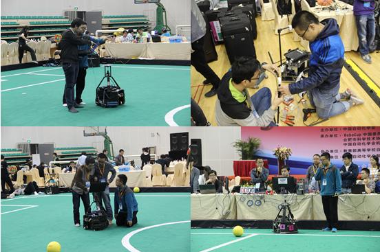 。。在本次大赛中,机器人中型组项目是一个传统国际合作项目,以MAS(Multi-Agent System)和DAI(Distributed Artificial Intelligence)为主要研究背景,该项目的最终目标是:到2050年,开发完全自主仿人机器人队,赢得人类足球世界冠军队。在本次大赛中,金年会jinnianhuicomROBIT代表队参加了科学挑战赛和技术挑战赛。科学挑战赛是一项学术交流性质很强的竞赛,其设立的目的便是为了给参赛队伍一个交流分享科研技术的平台,大家通过展示对于当前存在问题的解决方案和未来发展方向的研究,从而起到推动机器人科学发展的作用。软件科技创新创业基地机器人足球队加入中型组已经有六年的历史,在技术上一直不断探索,精益求精。在科学挑战赛中,ROBIT展示了他们在守门员系统方面的研究。在传统的全景视觉守门员中,存在对球的定位不够以及无法防守高空球等问题的解决。为了解决这些问题,球队增加了kinect深度摄像头来获得场地的深度信息,通过深度信息辅助判断从而准确预测球的运动路径,进行更好的防守策略,并且增加了可升降杆,从而实现对高空球的防守。最终,ROBIT在此项目上名列季军。