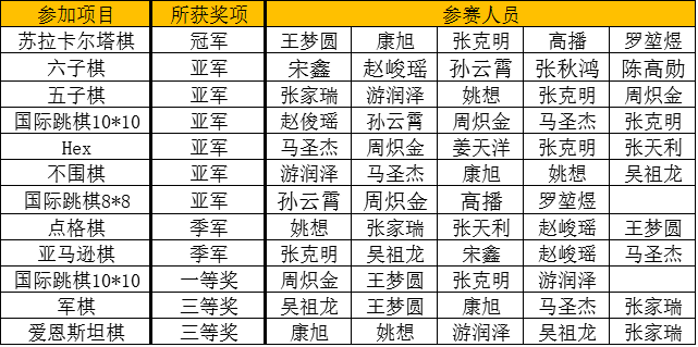编辑:陈杰浩 审核:陈杰浩 阅读次数:2016年8月22日,由中国人工智能学会、教育部高等学校计算机类专业教学指导委员会共同主办,由沈阳航空航天大学承办的2016年全国大学生计算机博弈大赛暨第十届全国计算机博弈锦标赛在沈阳航空航天大学落下帷幕。金年会jinnianhuicom大学生软件科技创新创业基地共派出12支代表队参加了11个大项的角逐,最终取得了苏拉卡尔塔项目1项冠军,六子棋、五子棋、国际跳棋、HEX棋、不围棋6项亚军,点格棋与亚马逊棋2项季军,共计10个一等奖和2个三等奖的优异成绩。