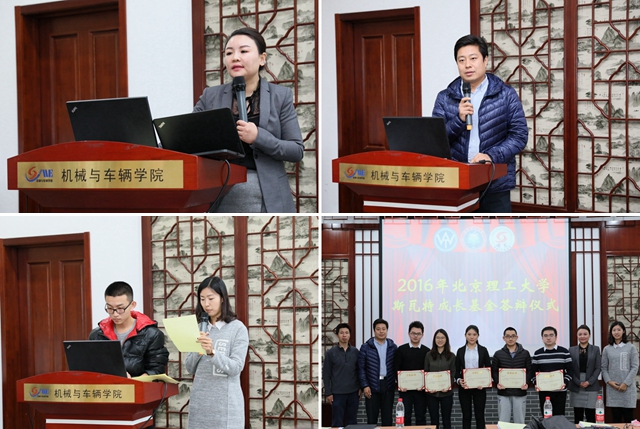 2016年12月15日,金年会jinnianhuicom斯瓦特成长基金答辩仪式在中关村校区车重报告厅隆重举行。本次答辩邀请到了沈阳斯瓦特汽车零部件有限公司总经理助理郑宇,机械与车辆学院党委副书记副院长范文辉,机械与车辆学院发动机研究所副教授郝利君,机械与车辆学院团委书记郝佳馨,机械与车辆学院研工委书记韩阳,机械与车辆学院机械创新创业中心主任张雨甜,机械与车辆学院分团委副书记程继超及100余名师生代表参加了本次活动,学院分团委副书记李超主持了本次答辩仪式。“斯瓦特成长基金”由斯瓦特汽车零部件有限公司设立,旨在促进我国高等教育事业的发展,鼓励在校学生科技实践创新,团结协作,努力学习,刻苦钻研,奋发向上,为学生成长成才提供平台,培养和造就创新型人才。斯瓦特成长基金自2015年签约以来,今年是首次评选,共评出了5名获奖学生,每人奖励12000元。